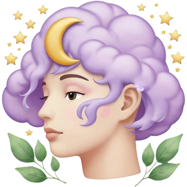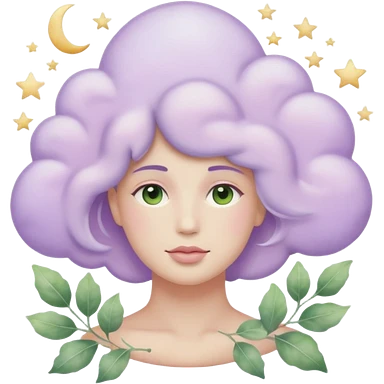watercolor-style emoji of a human head silhouette with “AI” inside a lilac cloud, connected to a soft circuit shape. gentle pastel palette (sage green, blush, lilac), surrounded by leaves, moon, and stars — poetic and calm aesthetic. emoji