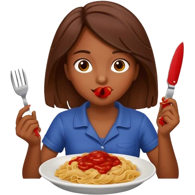 Brown skin Weird girl with brown hair eating pasta holding ketchup and a knife emoji