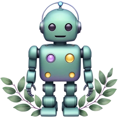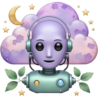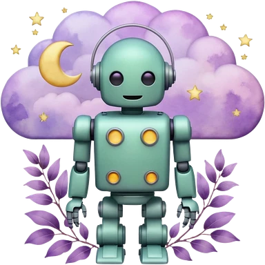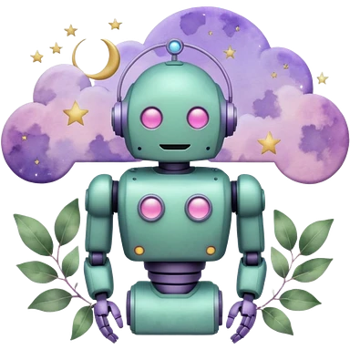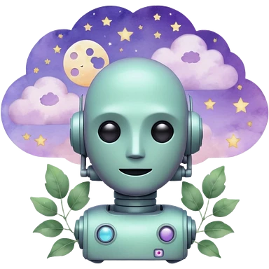 watercolor-style emoji of robot silhouette with “AI” inside a lilac cloud, connected to a soft circuit shape. gentle pastel palette (sage green, blush, lilac), surrounded by leaves, moon, and stars — poetic and calm aesthetic. emoji