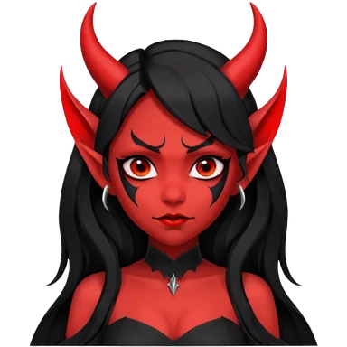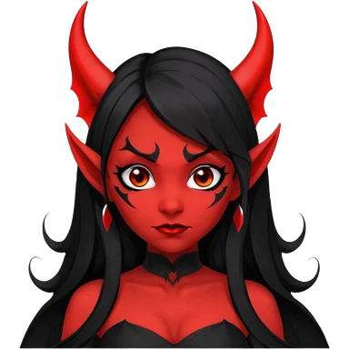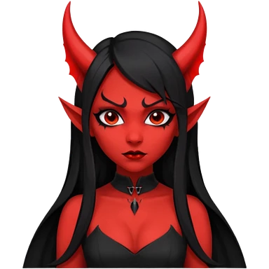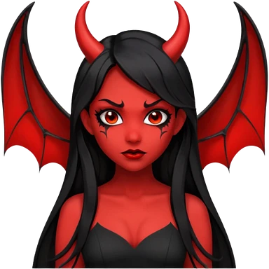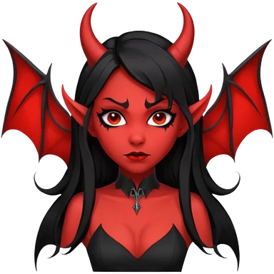 demon girl, skin red , black long hair, small horns, bat wing, black open-back dress, bold black outlines emoji
