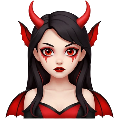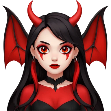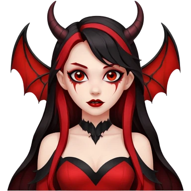 demon girl, skin red , black long hair, small horns, bat wing, black open-back dress, bold black outlines, red+black palette emoji