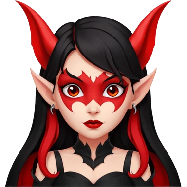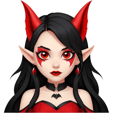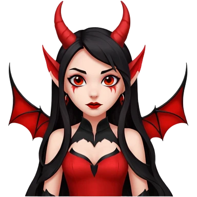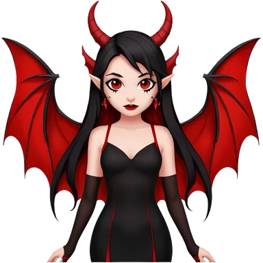 demon girl, skin red , black long hair, small horns, pointed ears, bat wing, black open-back dress, bold black outlines, red+black palette emoji
