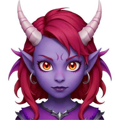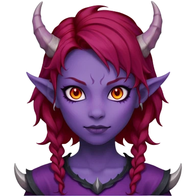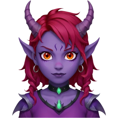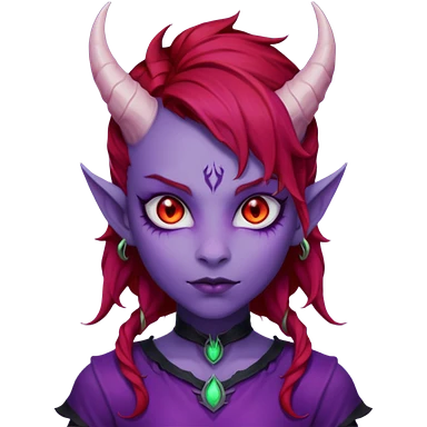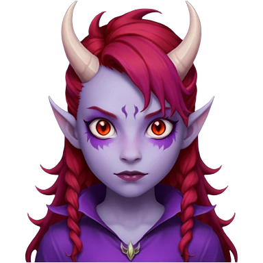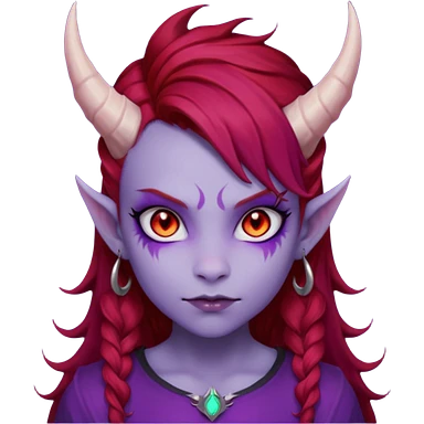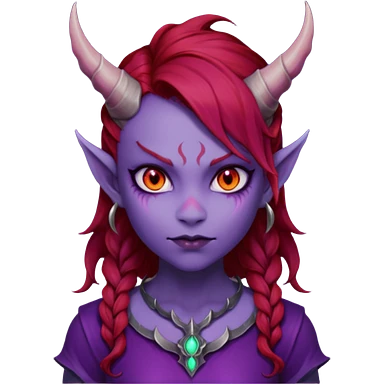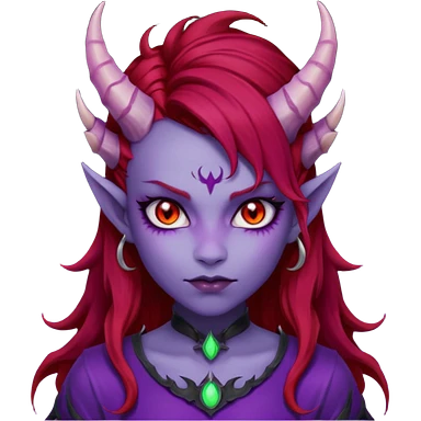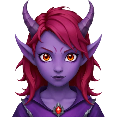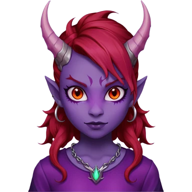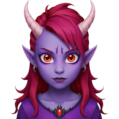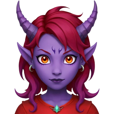 Demon Girl Purple Skin Dragon Horns Black Eyes Red Glowing Pupils Auburn Haired Red Shirt emoji | AI Emoji Generator