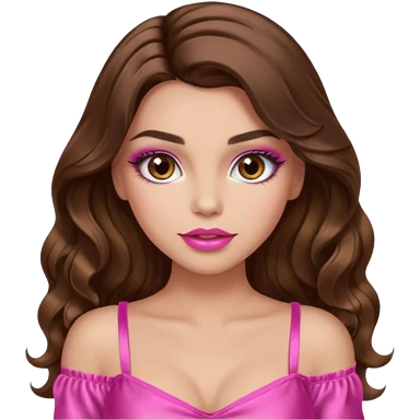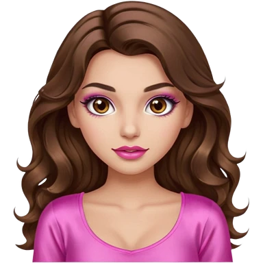 girl with long wavy brown hair, brown eyes, long lashes makeup, sexy pink lips, light to medium complexion, wearing a pink sexy top emoji