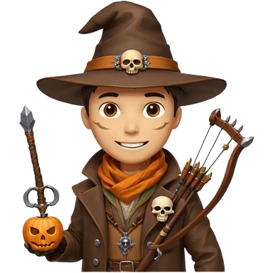male human monster hunter emoji, wearing brown leather coat and wide hat, holding crossbow or rifle, with amulet shaped like skull, Halloween fantasy theme, confident smile, orange scarf, Apple emoji style, clean white background, square image emoji