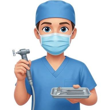 olive skin dentist with black hair holding dental tools, patient in chair emoji