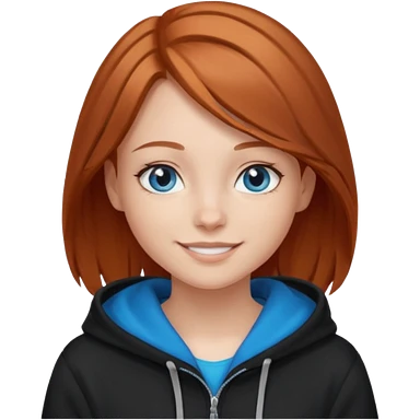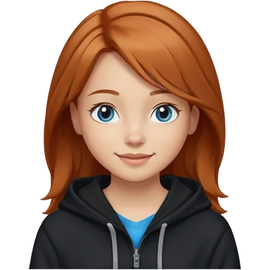 мила дівчинка зі світлим русим волоссям до грудей з голубими очами в чорному худі посміхається emoji