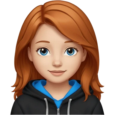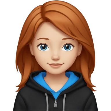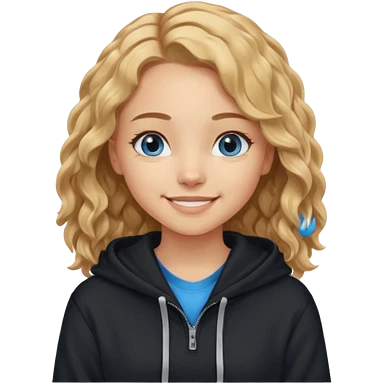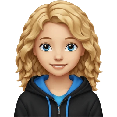 мила дівчинка з пшеничним хвилястим волоссям до грудей з голубими очами в чорному худі посміхається emoji