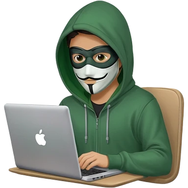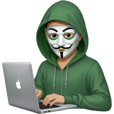 Хакер сидит в зелёной одежде в анонимус маске, печатает в ноутбуке, прозрачный фон. emoji