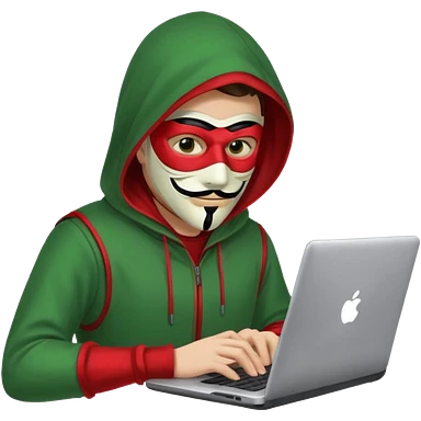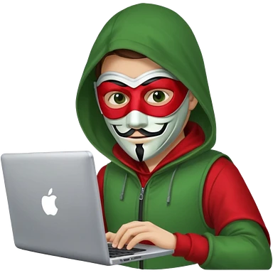 Хакер сидит в зелёно-красной одежде в анонимус маске, печатает в ноутбуке, прозрачный фон. emoji