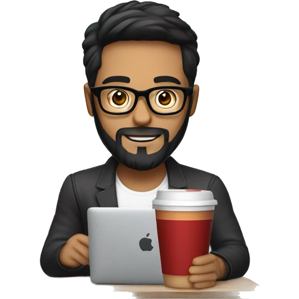 Designer with black hair, beard and glasses working with MacBook and drinking cappuccino ketchup bottle emoji | AI Emoji Generator
