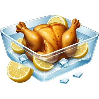 baked chicken with lemon wedges on a large platter, inside a large ice cube emoji
