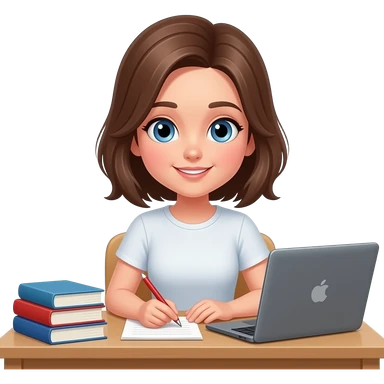 Girl at. Desk with Books and Laptop studying, Brown hair, Blue eyes emoji