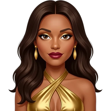 Tenitra Michelle Williams from Destiny's Child with dark brown eyes, long black hair, gold eyeshadow, dark red lipstick, gold metallic halter dress, gold earrings emoji