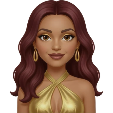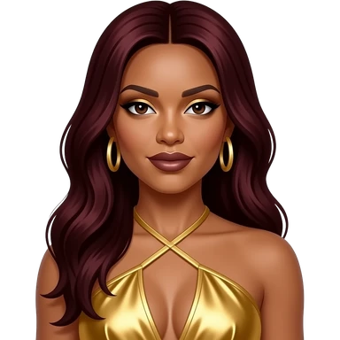 Tenitra Michelle Williams from Destiny's Child with dark brown eyes, long dark brown hair, gold eyeshadow, dark red lipstick, gold metallic halter dress, gold earrings emoji