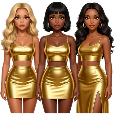 Destiny's Child with Beyonce with hazel eyes, long blonde hair, gold metallic crop top and skirt, Kelly with dark brown eyes, medium black hair, gold metallic crop top and skirt, Michelle with dark brown eyes, long black hair, gold metallic crop top and long skirt emoji