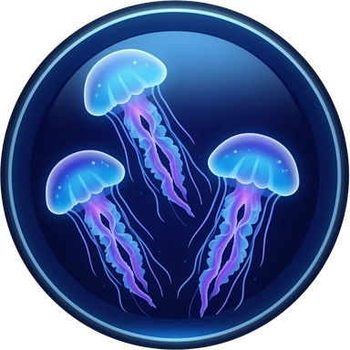 Big three jellyfish in a flat round aquarium swimming blue and purple light (dark water) emoji