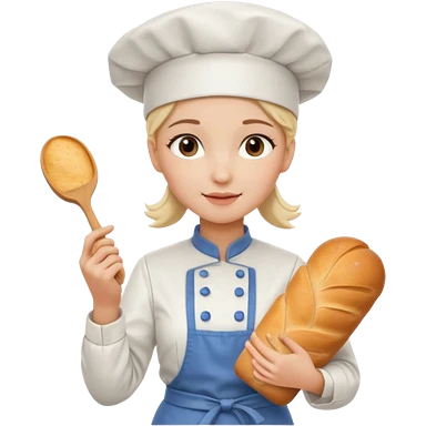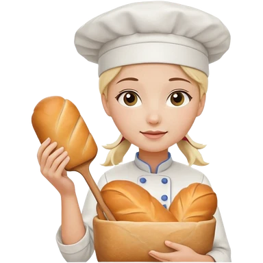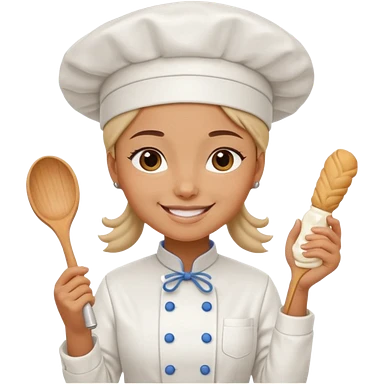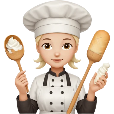 Young female baker - wearing a white chef's hat, holding a cream piping bag and bread in her hand emoji