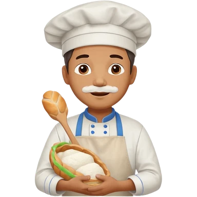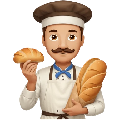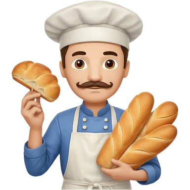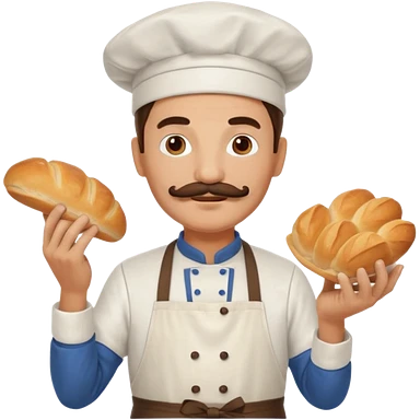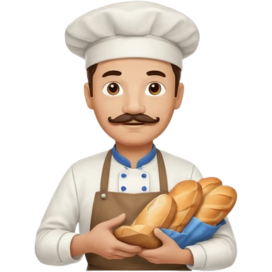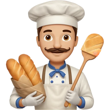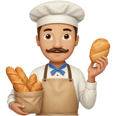Middle aged male pastry chef - with a mustache, apron, white hat, holding a bag of bread emoji