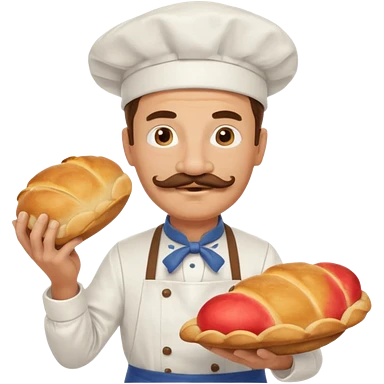Middle aged male pastry chef - with a mustache, apron, white hat, holding bread emoji