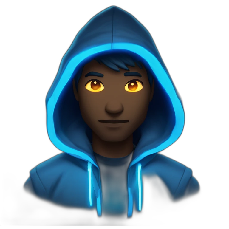 developer behind his laptop with this style : Riot Games Valorant dark blue glowing bright neon blue sparks black hooded assassin themed character emoji | AI Emoji Generator