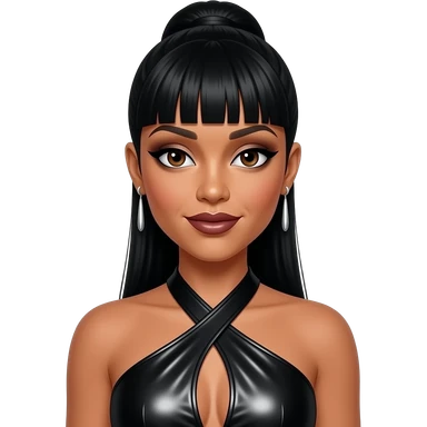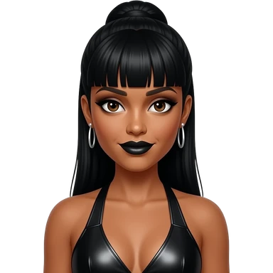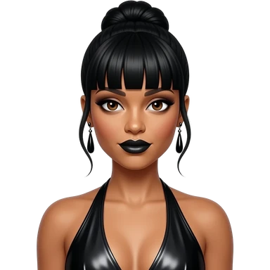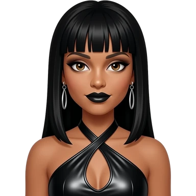 LeToya Luckett from Destiny's Child with dark brown eyes, long black 1990s straight bang hair, black eyeshadow, black lipstick, black metallic halter dress, earrings emoji