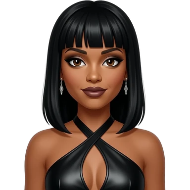 LeToya Luckett from Destiny's Child with dark brown eyes, long black shoulder length bang hair, black eyeshadow and lipstick, black metallic halter dress, earrings emoji