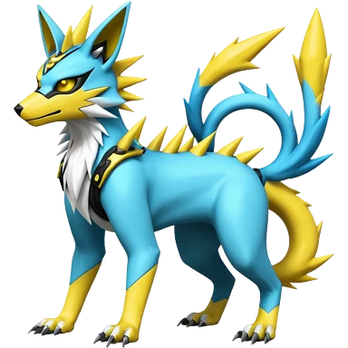 Shiny cyan yellow gothic edgy spiky white electric complex futuristic white-cyber-masked Zeraora-Renamon-Electrike-Umbreon-Lombax-Weregarurumon-fusion-creature (full body emoji