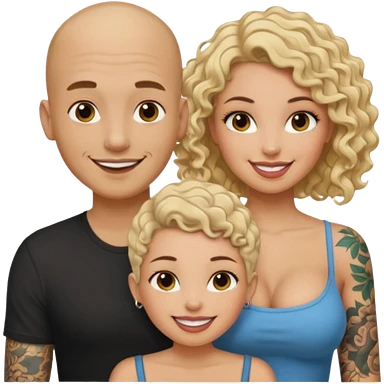 throuple tatted bald boyfriend with two girlfriends, one long blonde hair, other short curly brunette emoji