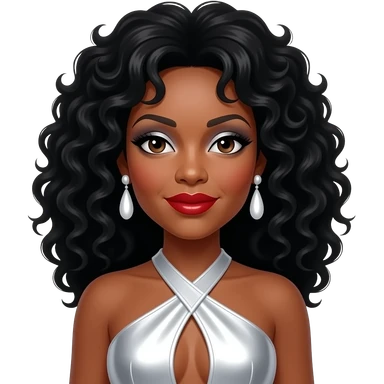 Diana Ross with dark brown eyes, long black disco curls hair, silver eyeshadow, red lipstick, white metallic halter dress, white earrings emoji