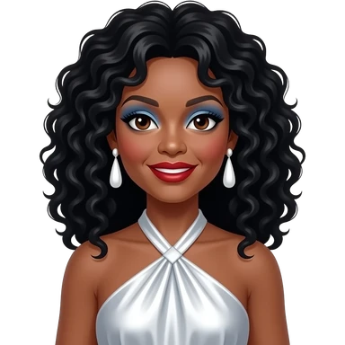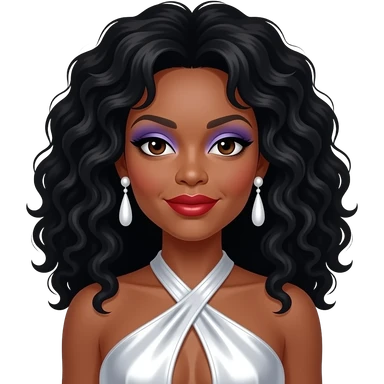 Diana Ross with dark brown eyes, long black disco curls hair, periwinkle eyeshadow, red lipstick, white metallic halter dress, white earrings emoji
