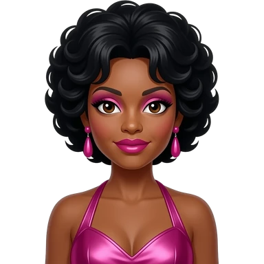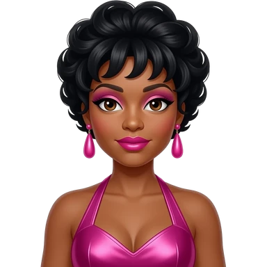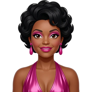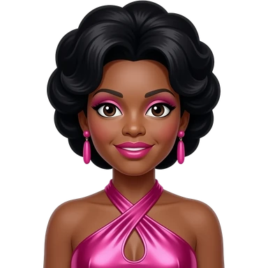 Diana Ross from The Supremes with dark brown eyes, black beehive hairdo, pink eyeshadow and lipstick, hot pink metallic halter dress, pink earrings emoji | AI Emoji Generator