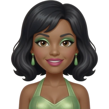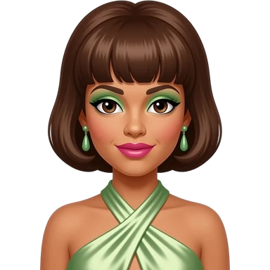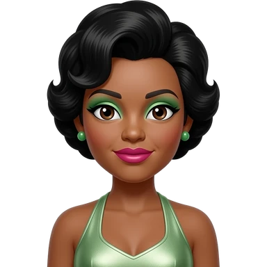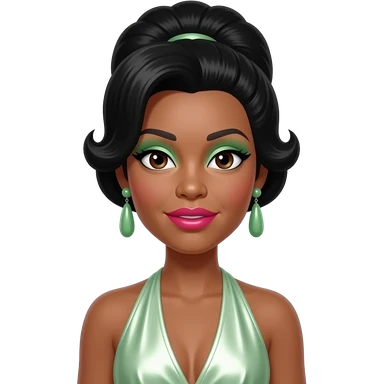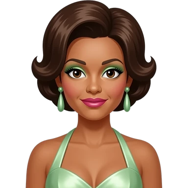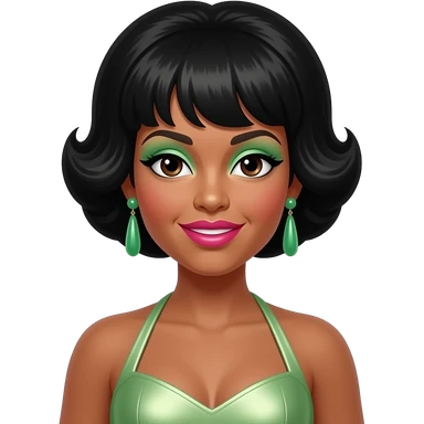 Mary Wilson from The Supremes with dark brown eyes, black beehive hair, light green eyeshadow, hot pink lipstick, light green metallic halter dress, green earrings emoji
