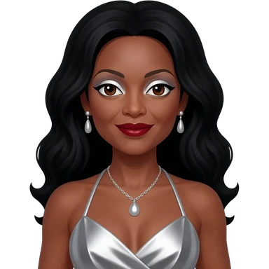 Diana Ross with brown eyes, long black hair, silver metallic off shoulder dress, silver necklace emoji