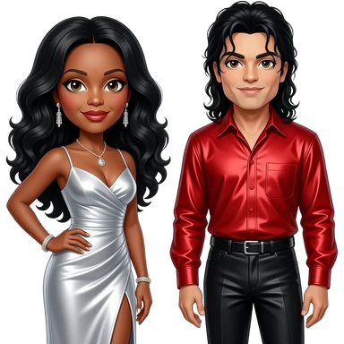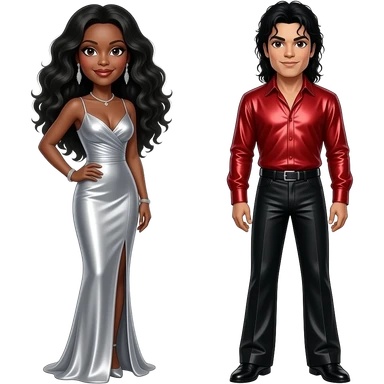 Diana Ross with brown eyes, long black hair, silver long dress, Michael Jackson with brown eyes, long black hair, red metallic shirt, black metallic wide leg pants emoji