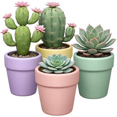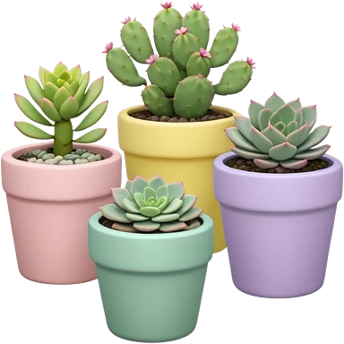 A pastel pink ceramic pot with a sedum succulent, a pastel green ceramic pot with a graptopetalum succulent, a pastel yellow ceramic pot with an echeveria succulent, and a pastel purple ceramic pot with a flowering cactus. All are cylindrical and placed separately on the floor. emoji