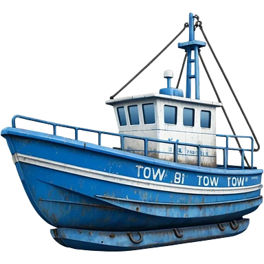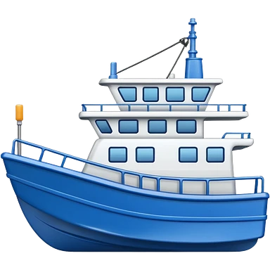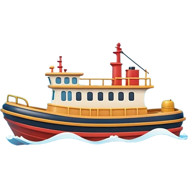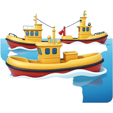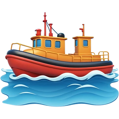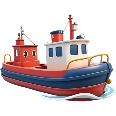 A 3D cartoon tugboat towing another boat on calm blue water, soft waves, clear sky, Memoji-style. emoji