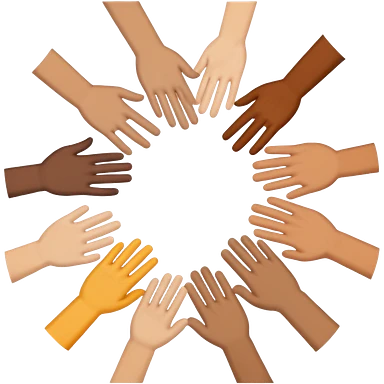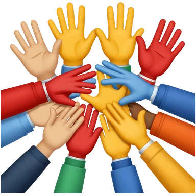 Emoji-style icon showing several diverse hands forming a circle or high-five together, symbolizing unity and team spirit. Flat minimal Apple-style emoji, bright colors, white background, soft shadows. emoji