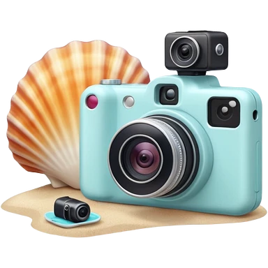 A seashell with a tiny camera next to it, symbolizing capturing beach memories. Playful, modern emoji style, soft pastel colors, white background. emoji