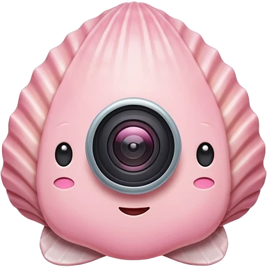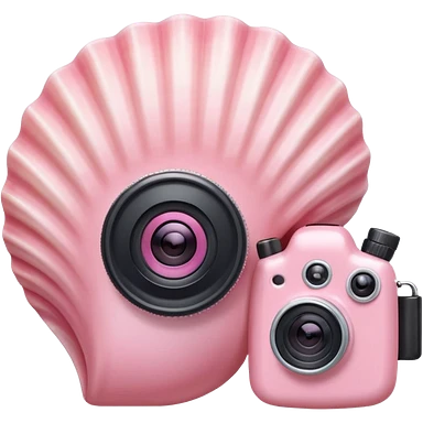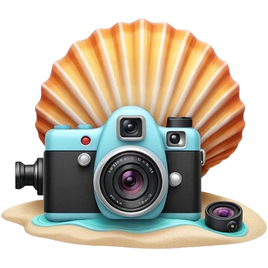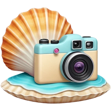 A cute seashell emoji with a tiny camera next to it, symbolizing capturing beach memories. Playful, modern emoji style, soft pastel colors, white background. emoji