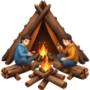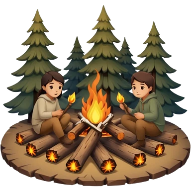 A cozy campfire emoji with two logs and glowing embers, with subtle human silhouettes sitting around. Warm tones, minimal flat emoji style, white background. emoji