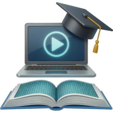 3D icon, online course. Stylized laptop or monitor with a glowing play button on screen. Floating graduation cap above the screen. Open book transforming into digital code below.Clean white background. Minimalist, corporate style emoji