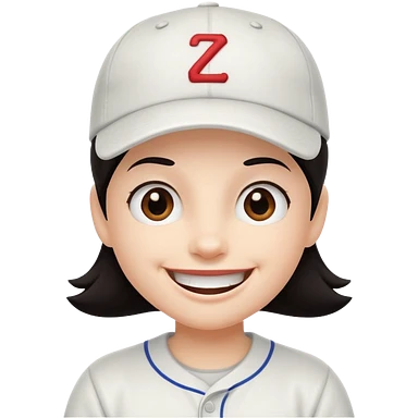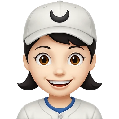 Digital illustration of a cartoon character with a big smile on its face and winking with one eye. The character has long dark hair and is wearing a white baseball cap and casual clothes. The overall style of the illustration is cute and playful.emoji