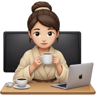 A brunette girl with a bun as hairstyle, with dark brown eyes, dark circles under eyes, tired, sad face, with a mug of coffee in one hand and sitting in front of a computer, wearing a soft fluffy beige robe emoji