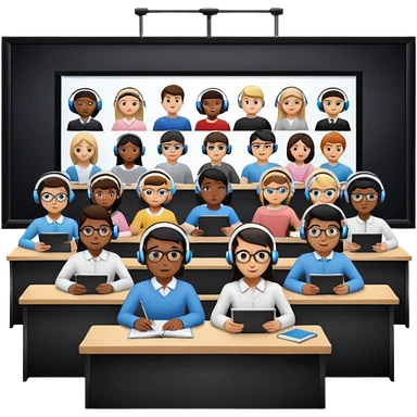 Birdseye view of large study space with students working separately add students wearing Vision Pro headsetd emoji