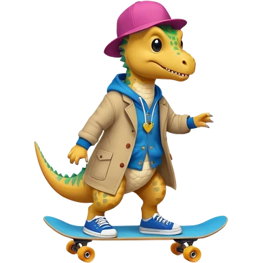 a dinosaur on a skateboard wearing a coat with sneakers in the bottom a cute pokie hairball on the top emoji