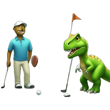 A cute cartoon dinosaur wearing a golf cap, holding a golf club, and smiling while standing on a green golf course with a small golf ball nearby. Bright, cheerful colors, simple and fun design. emoji