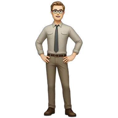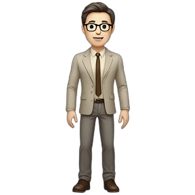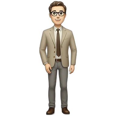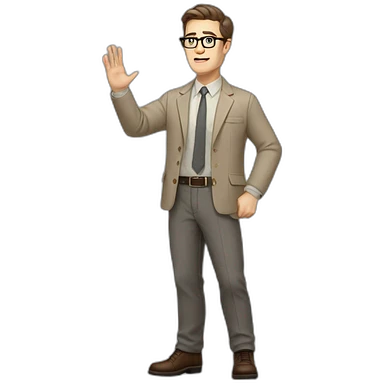 Full height Actively Gesturing Pale skinned fit man with dark brown hair in gray jacket, beige office shirt, brown tie, brown pants and vintage glasses. emoji