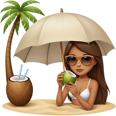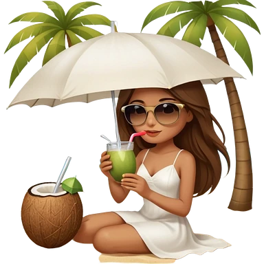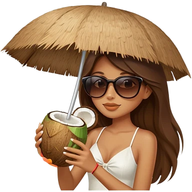 Girl with long brown hair wearing sunglasses and sipping from a coconut elegant sand and white aesthetic umbrella emoji