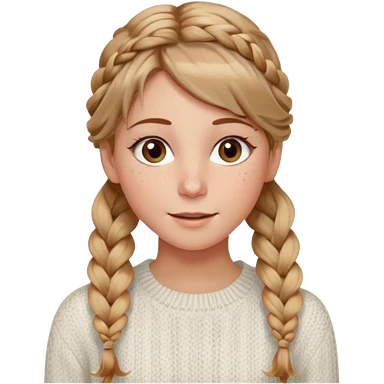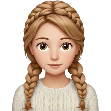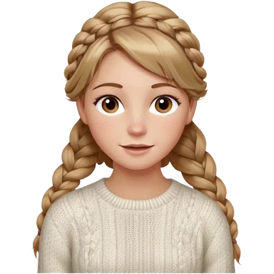 dirty blonde hazel/green eyes woman with a white cable knit sweater and one braid down her back with tendrils of hair flowing down her face and she is happy pale, some freckles, blush. she has a cateye wing and long lashes emoji | AI Emoji Generator